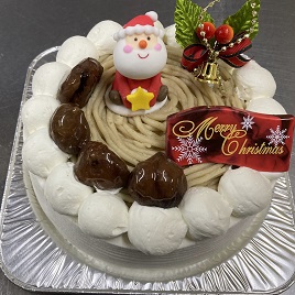 Xmas マロンケーキ 刻み栗とマロンクリームをサンド 和栗ペーストクリームと渋皮付きマロンを のせて仕上げました 4号(約12cm)¥3500 5号(約15cm)¥4600 写真のサイズは 5号 ※プレートは他のケーキと同じ 木の葉型のものになります |